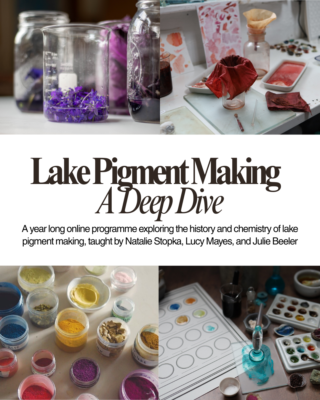 Following a historical trajectory of making lake pigments from ancient Egyptian recipes, to medieval approaches, and modern day techniques. Taught by Natalie Stopka, Lucy Mayes, and Julie Beeler, leading monthly live online sessions covering different perspectives and processes for practicing this age-old approach to pigment making.