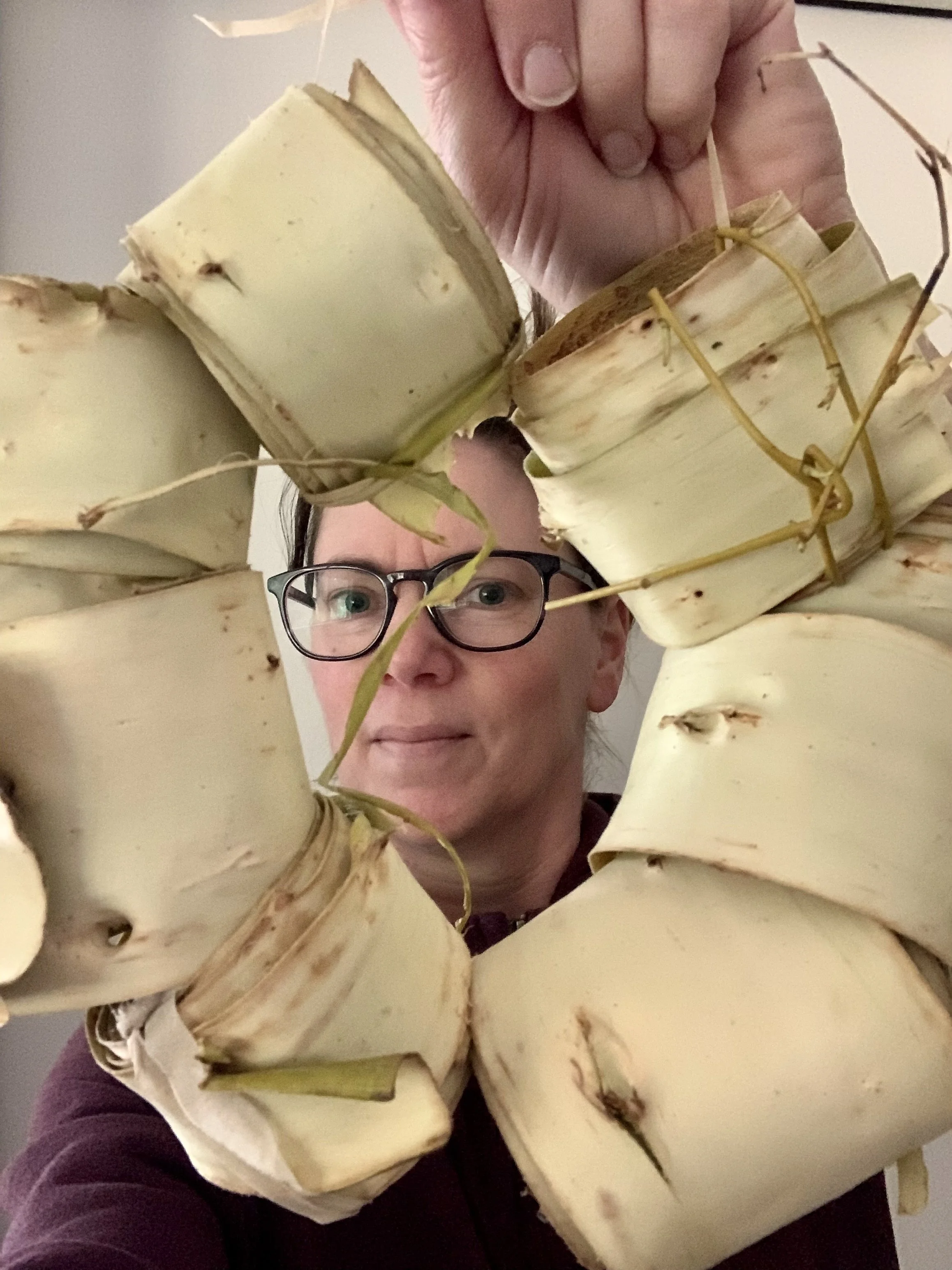 Working with bark; weaving, shaping and stitching.
